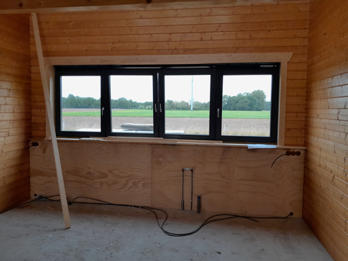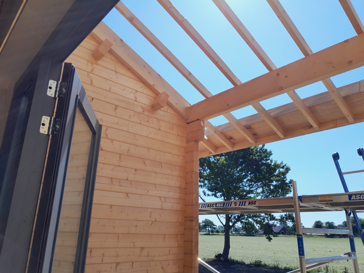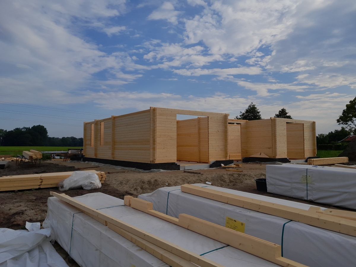 Hier vindt u foto's van de bouwfase en maatvoeringen van deze logwoning met een RedCedar-buitenbekleding die we in Sinderen gebouwd hebben.