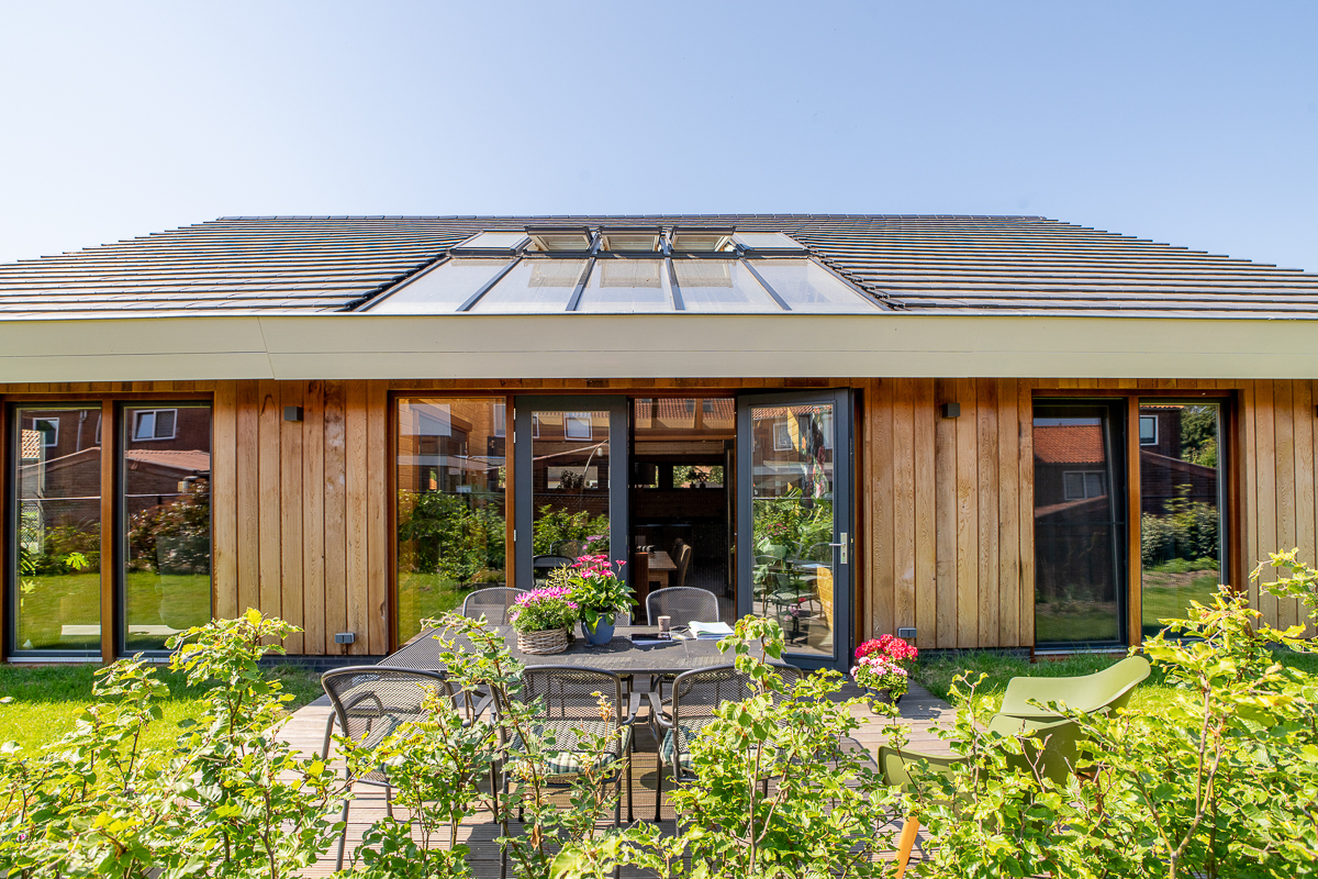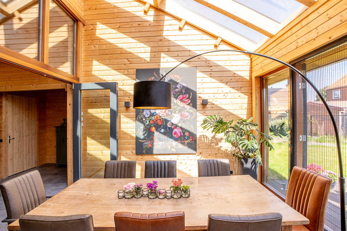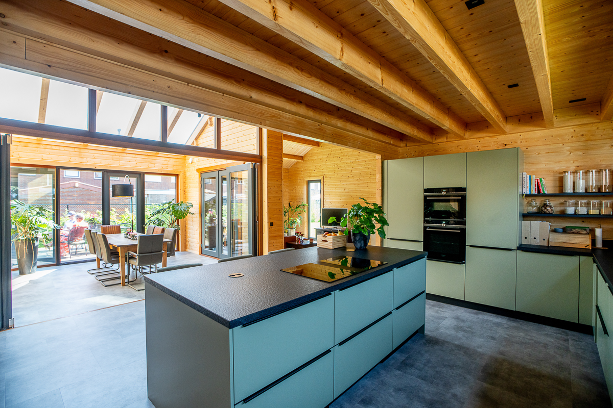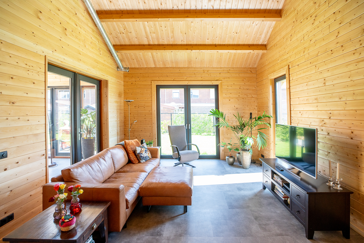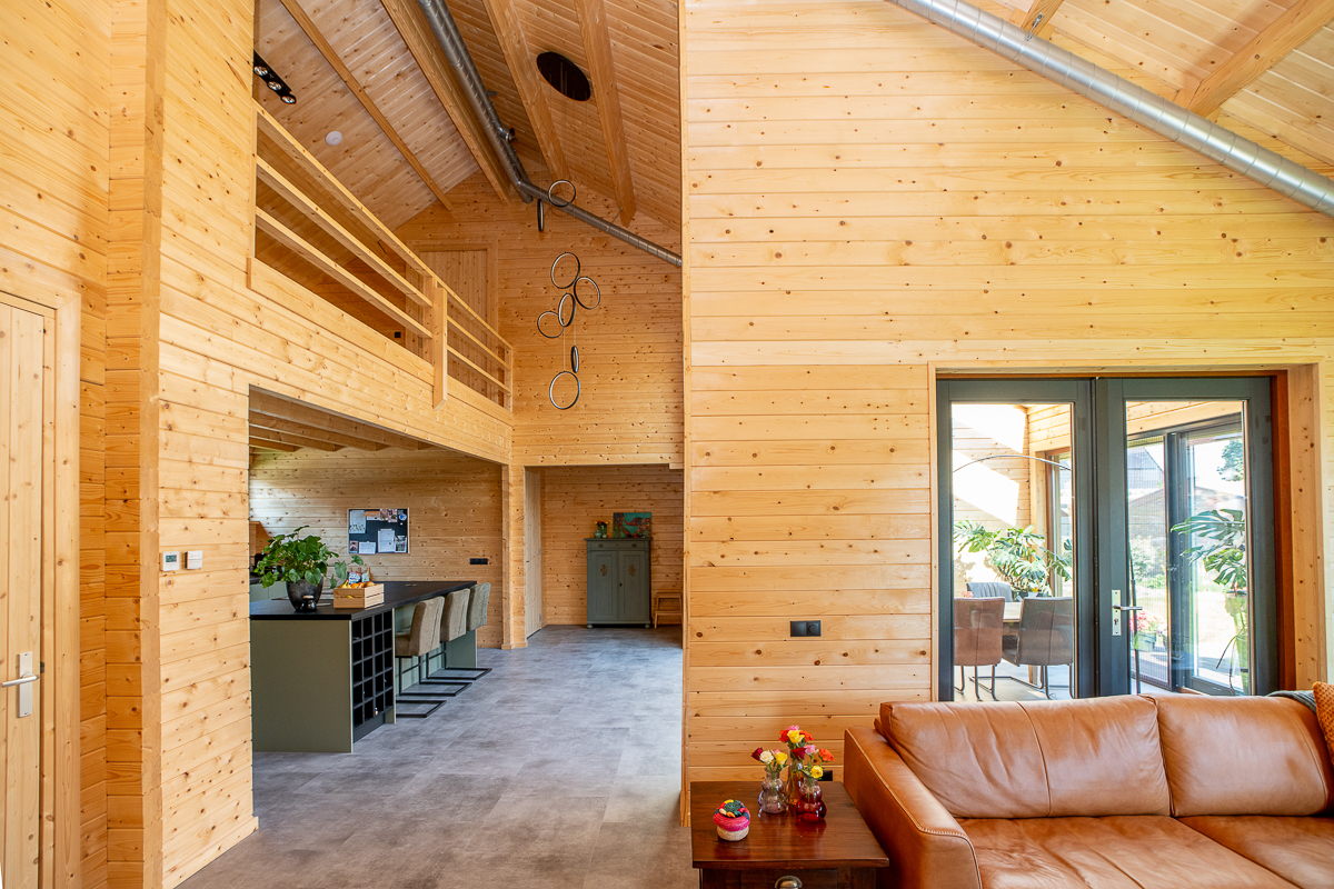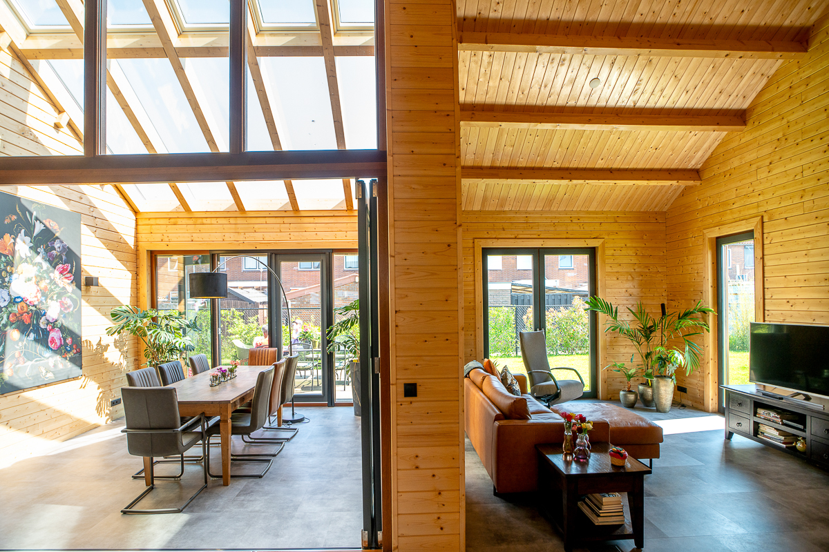 Deze fraaie logwoning heeft een inpandige serre met harmonicadeuren richting de open keuken. Levensloopbestendig: met een slaapkamer en aangrenzende badkamer op de begane grond.