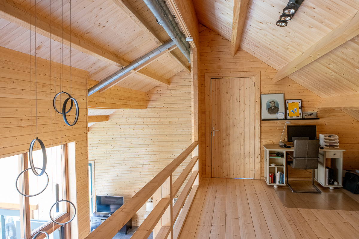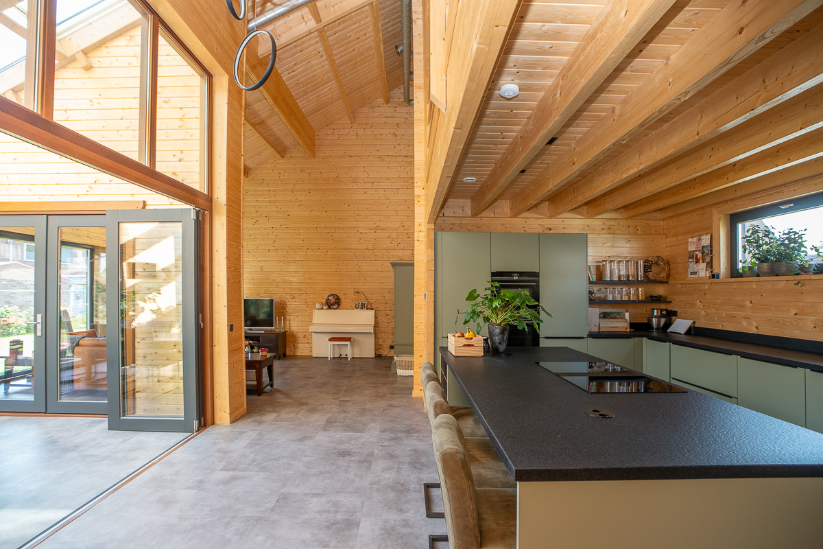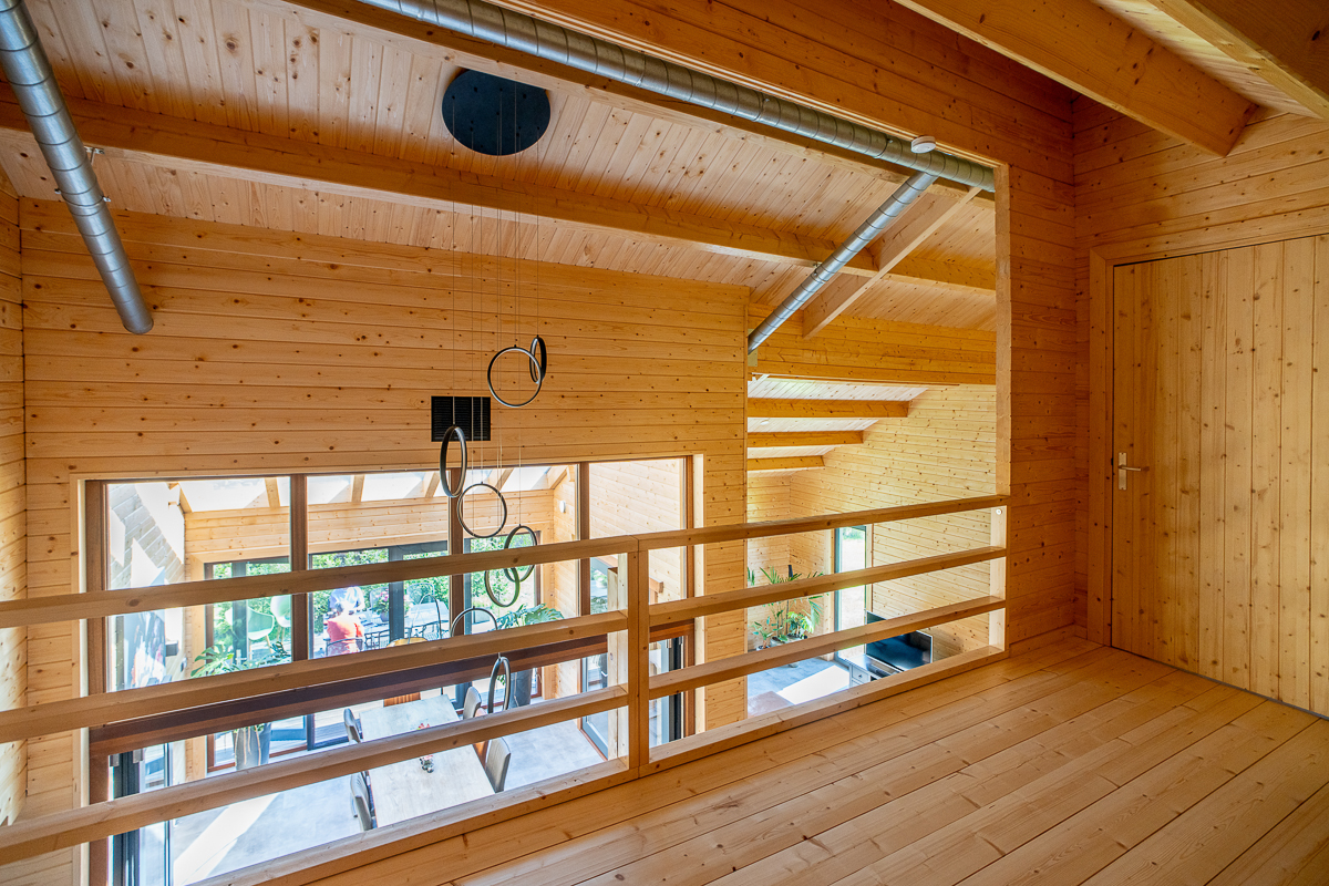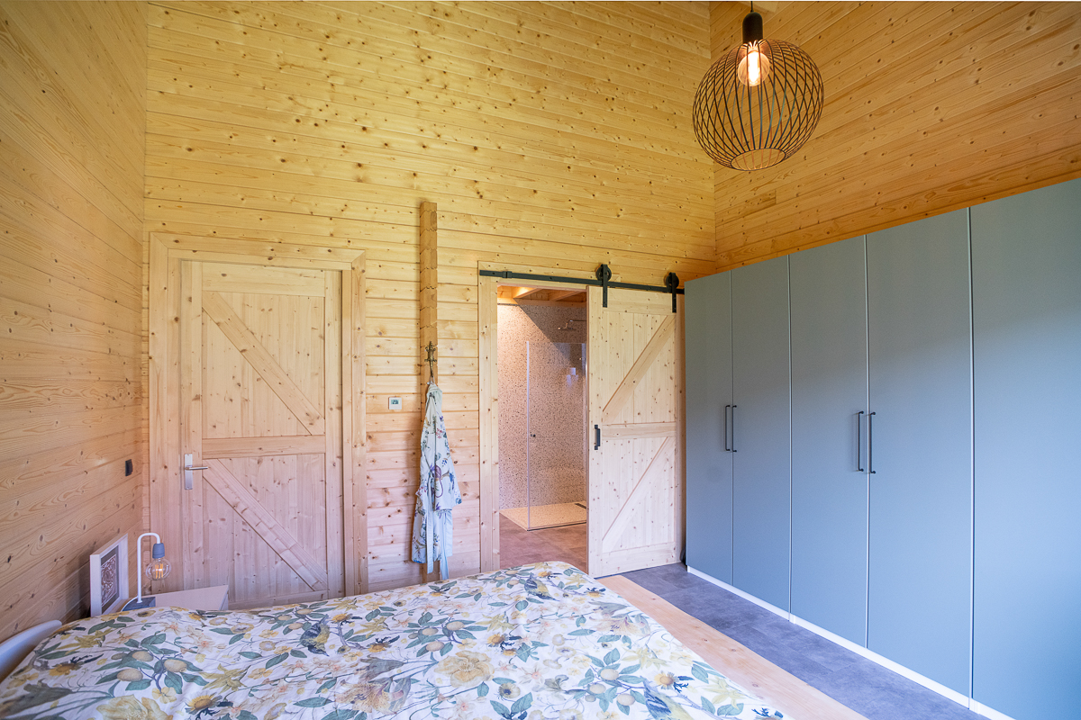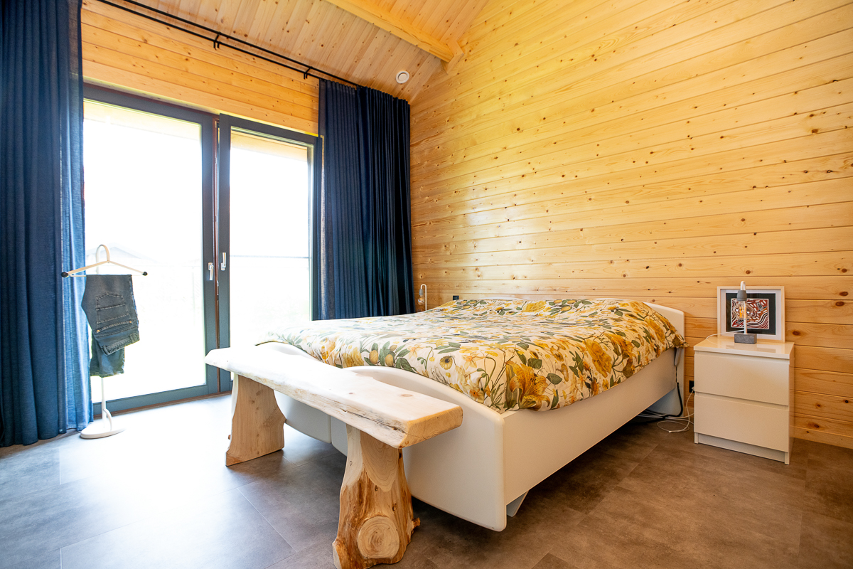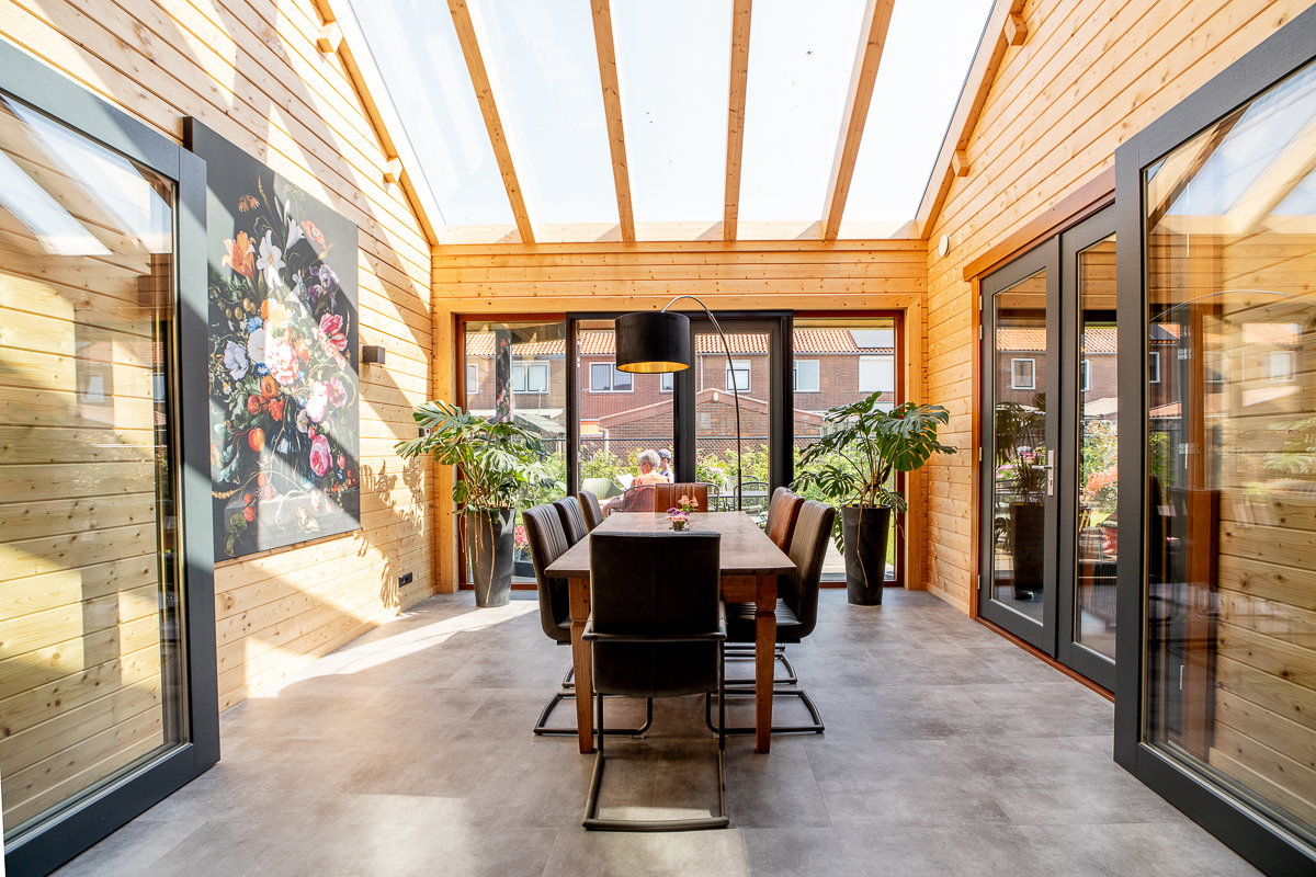 Deze fraaie logwoning heeft een inpandige serre met harmonicadeuren richting de open keuken. Levensloopbestendig: met een slaapkamer en aangrenzende badkamer op de begane grond.